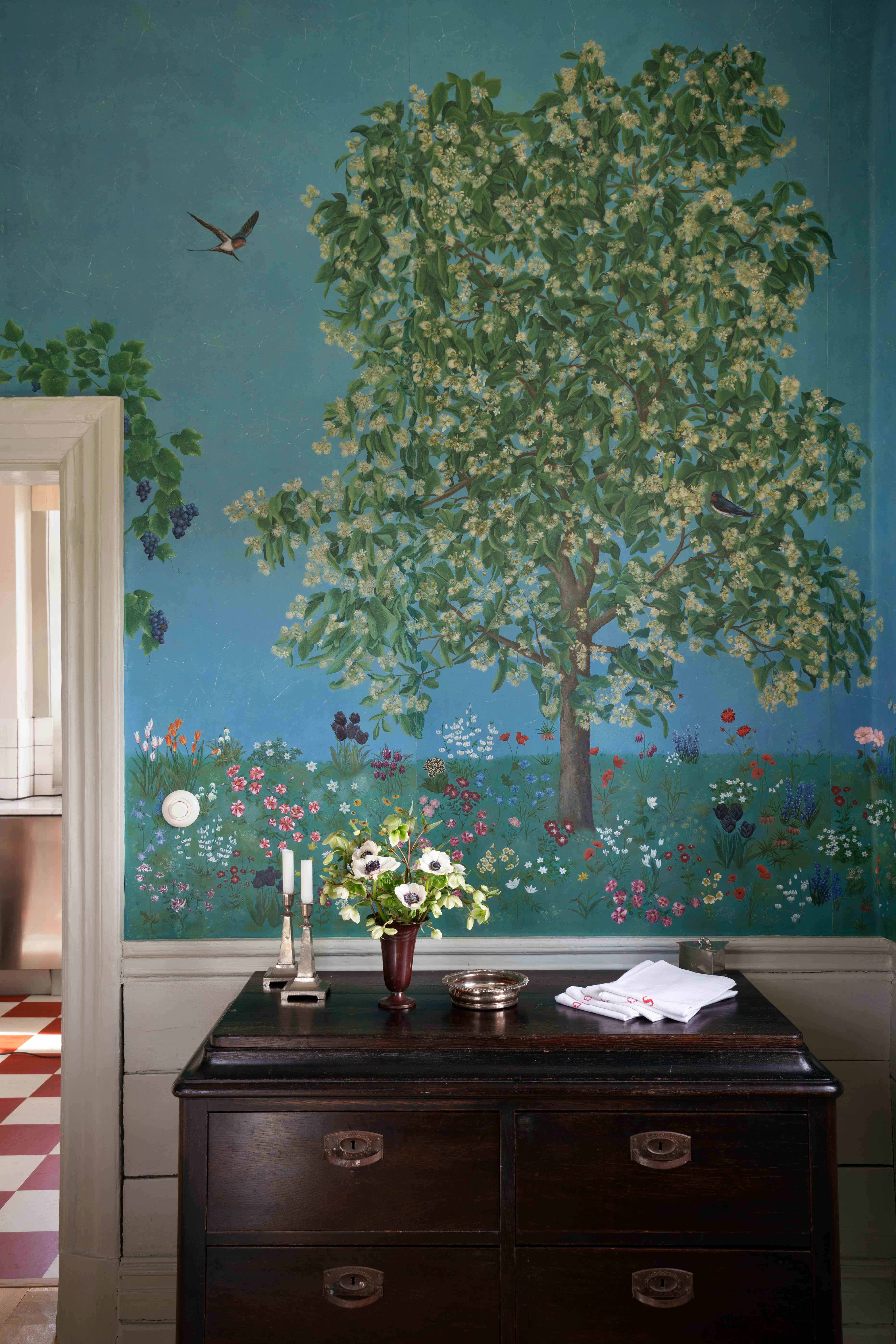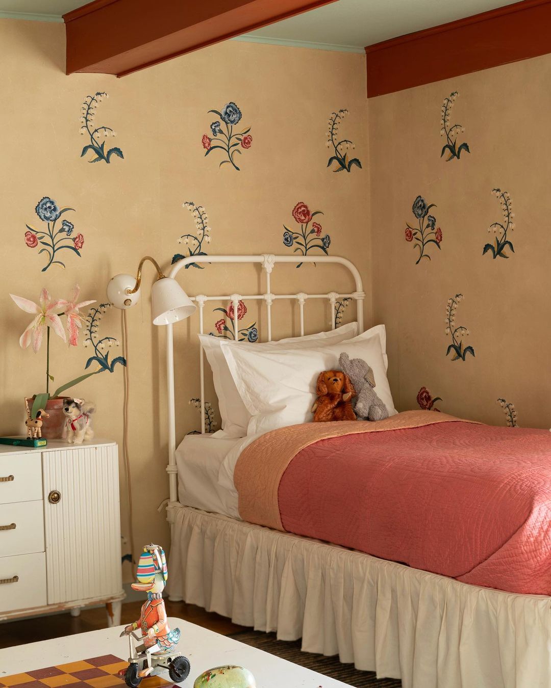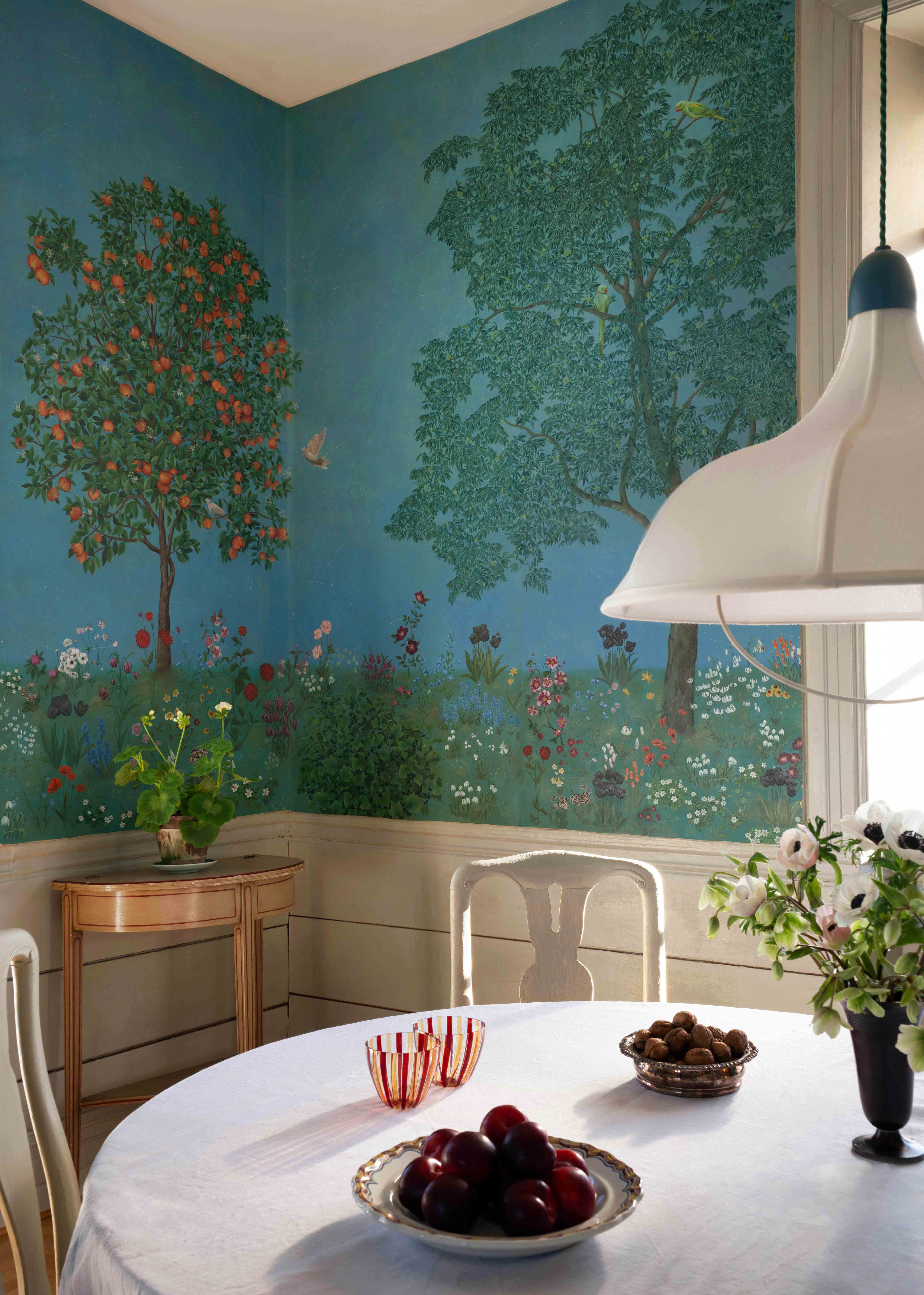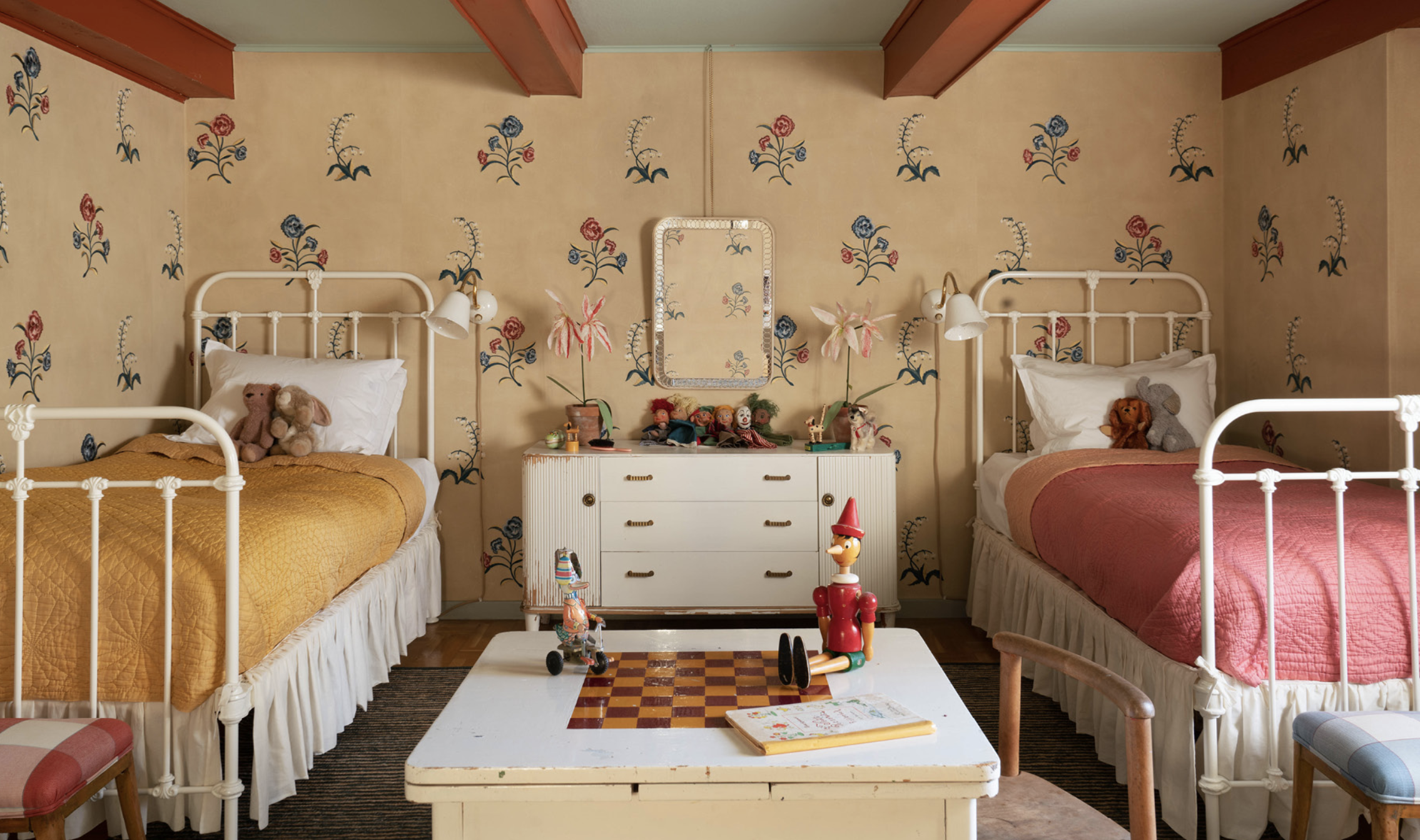 Nestled in the attic of her family’s Swedish farmhouse, designer Beata Heuman (@beataheuman) cocooned her daughters’ bedroom in a bespoke embroidered wallcovering by de Gournay. The delicate floral sprig motif was inspired by an antique silk embroidery fragment, but by reimagining the scale and altering the repeat, the historic design takes on a playful new character. Each posy is entirely embroidered by hand using thick, textural threads— bestowing each flower with an almost relief-like effect— on a humble brown rice paper ground.