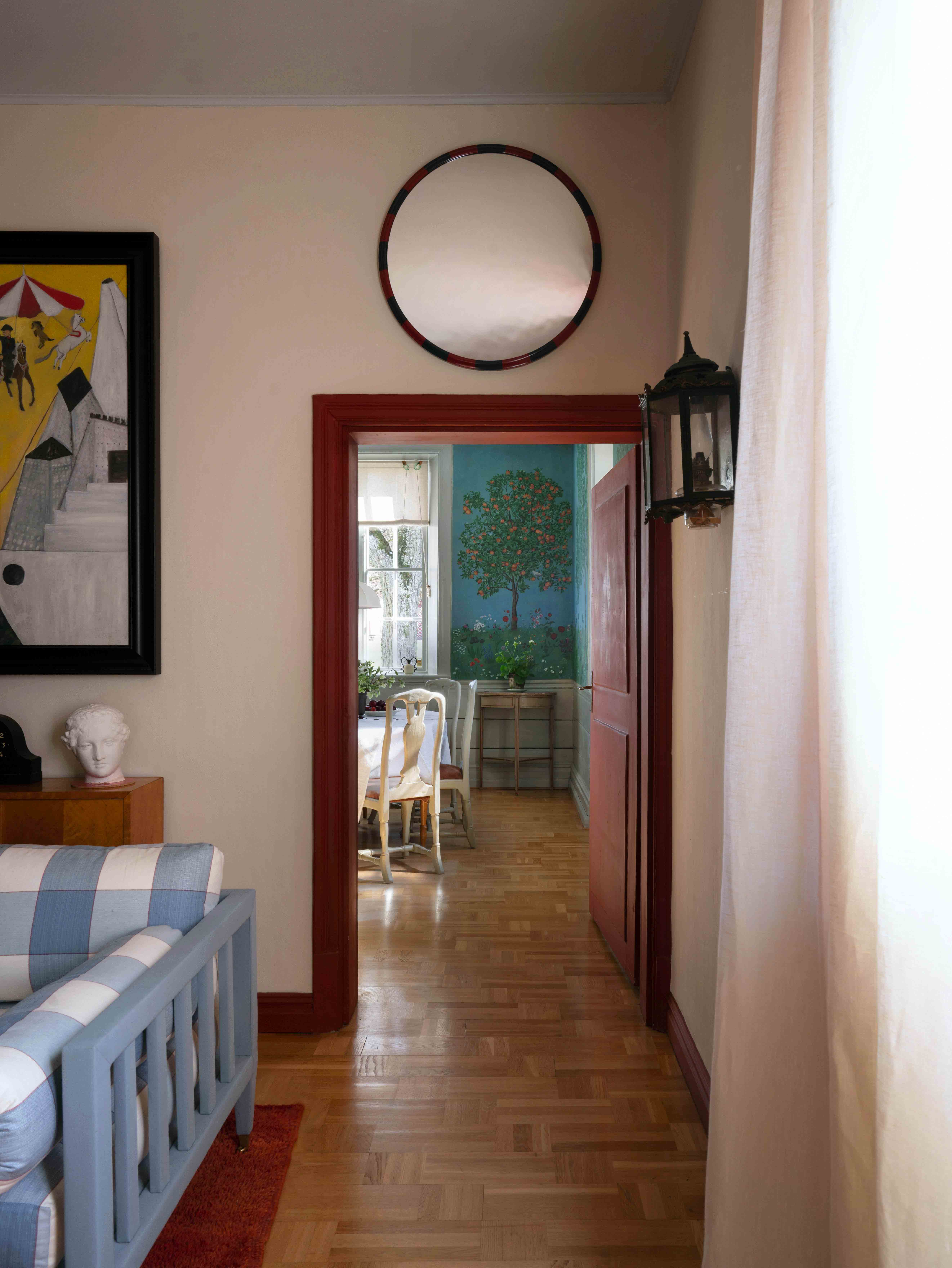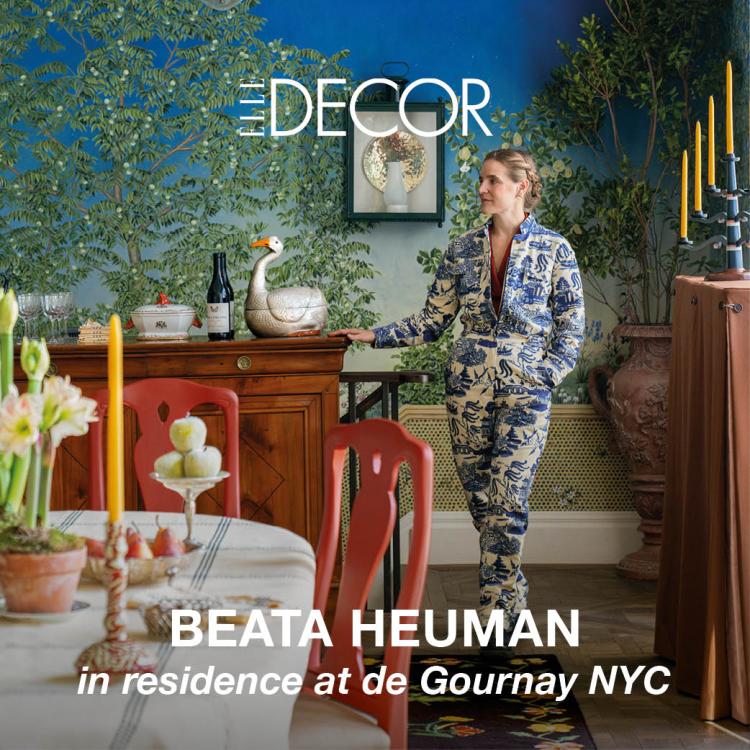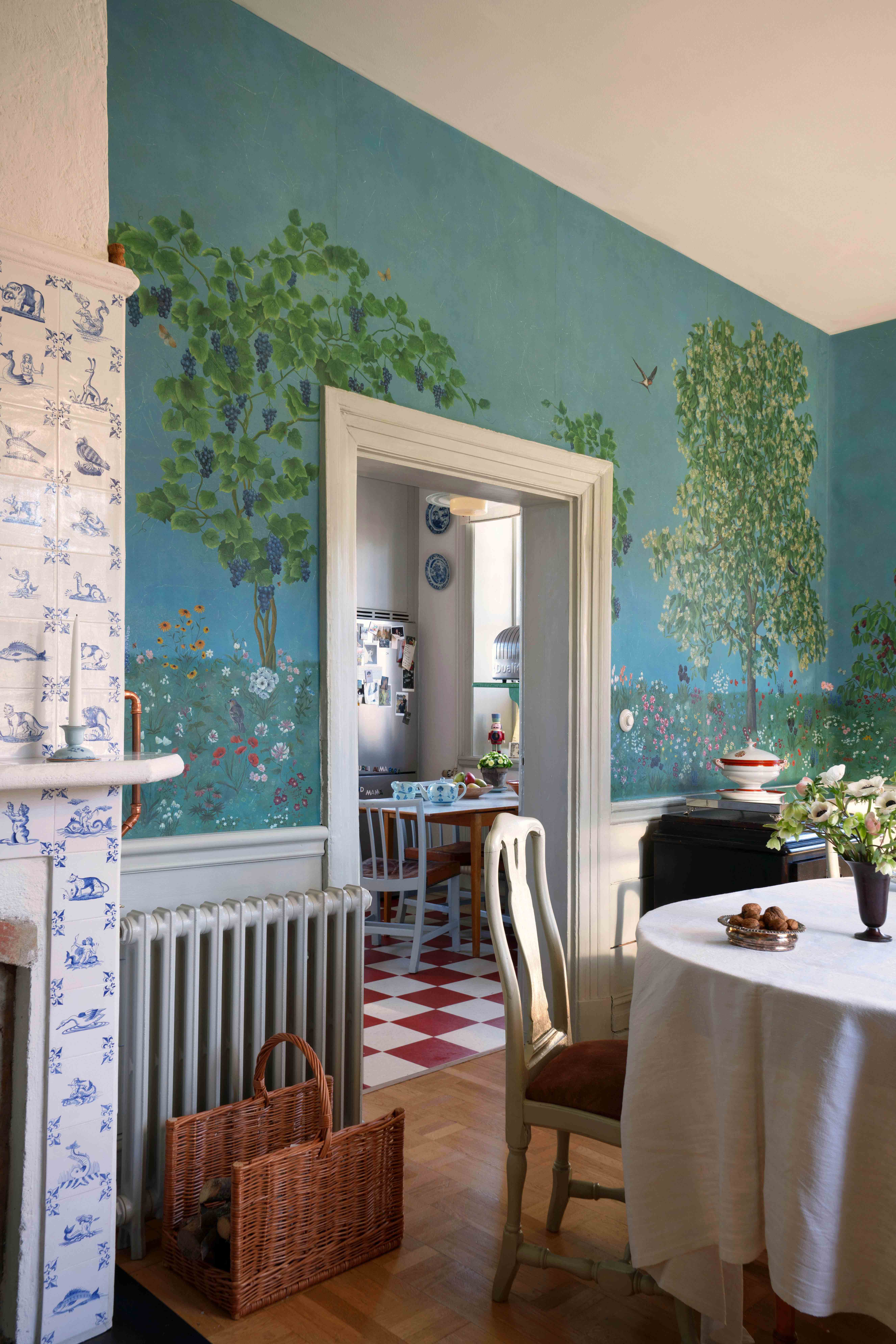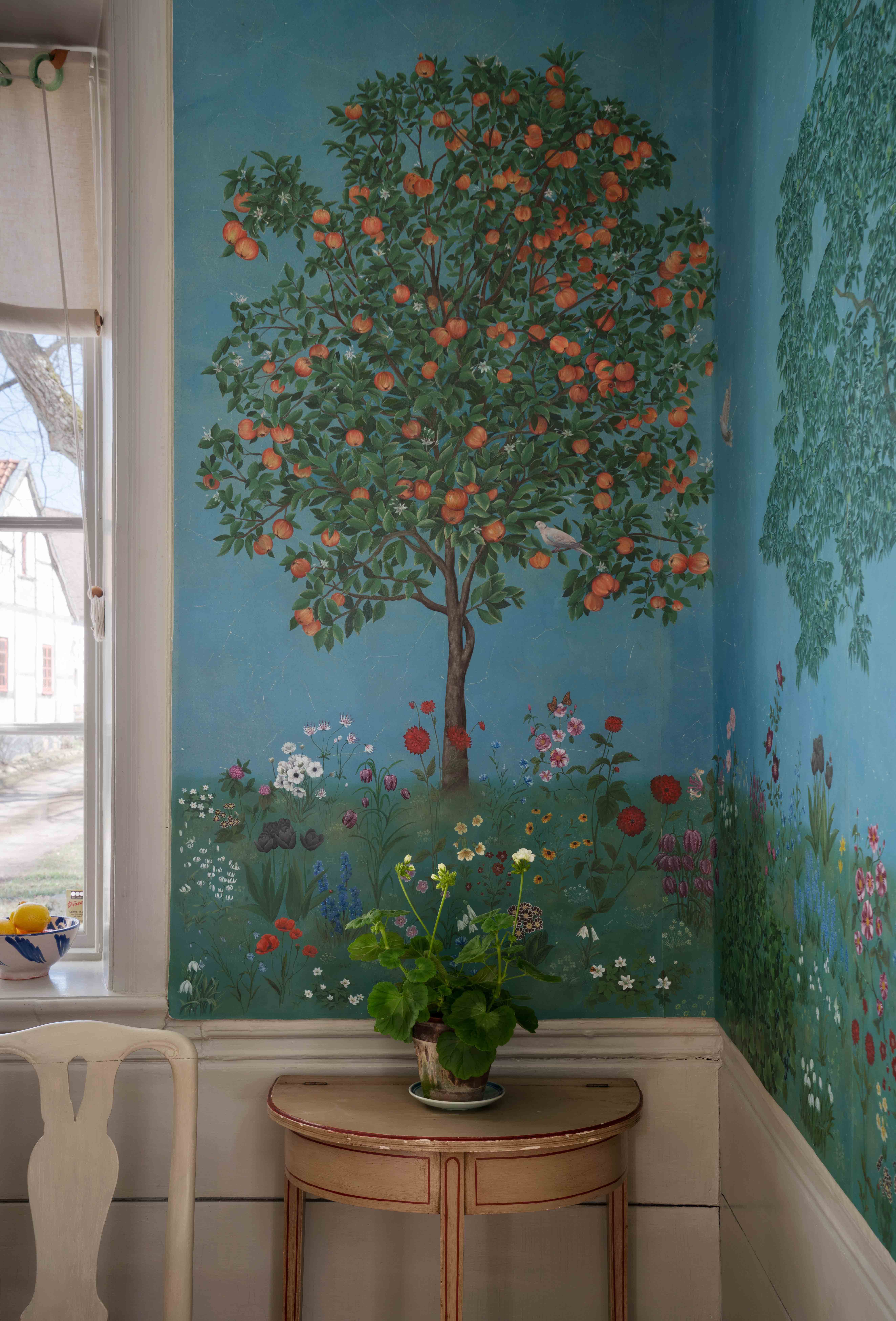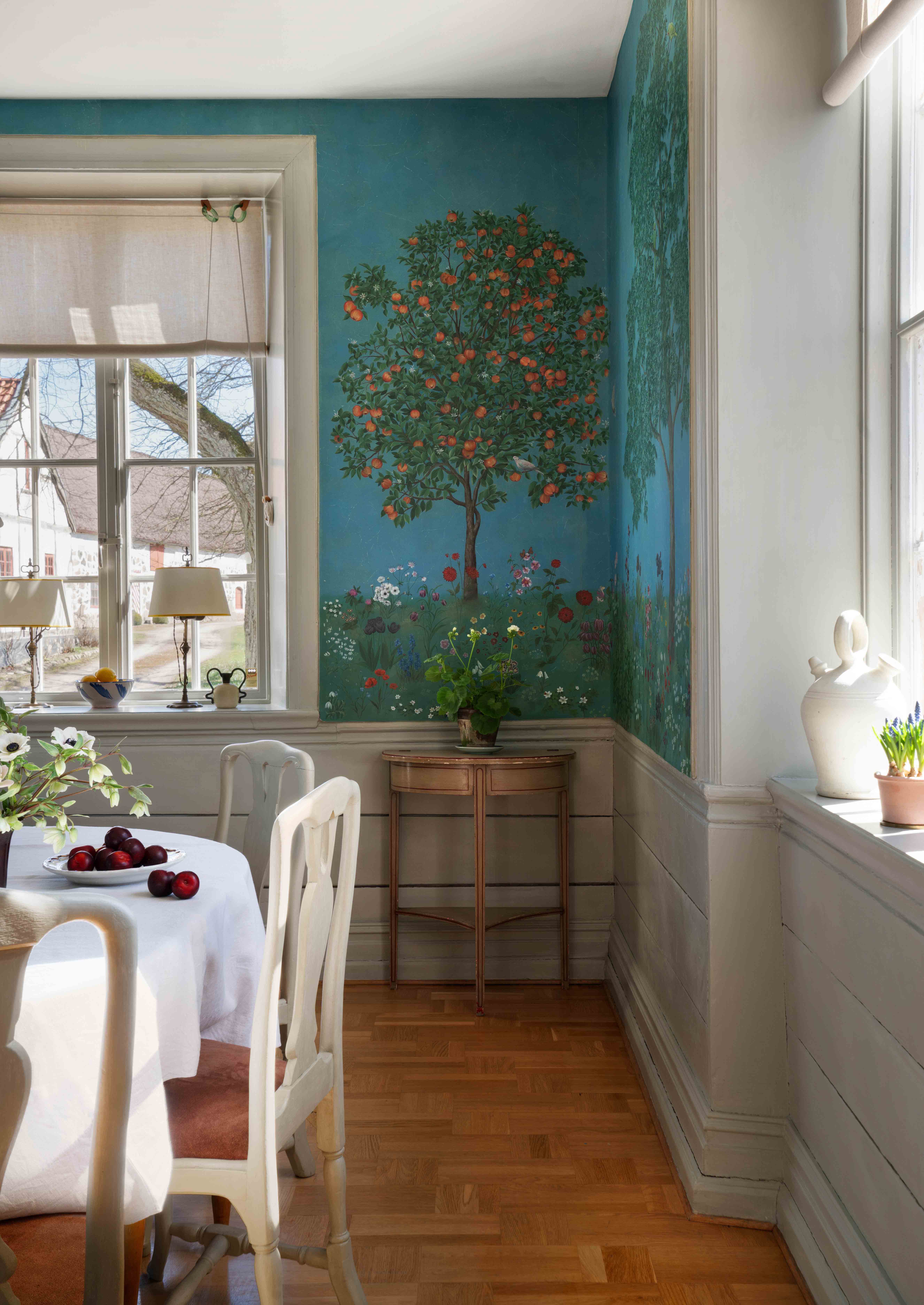 Nestled in the attic of her family’s Swedish farmhouse, designer Beata Heuman (@beataheuman) cocooned her daughters’ bedroom in a bespoke embroidered wallcovering by de Gournay. The delicate floral sprig motif was inspired by an antique silk embroidery fragment, but by reimagining the scale and altering the repeat, the historic design takes on a playful new character. Each posy is entirely embroidered by hand using thick, textural threads— bestowing each flower with an almost relief-like effect— on a humble brown rice paper ground.