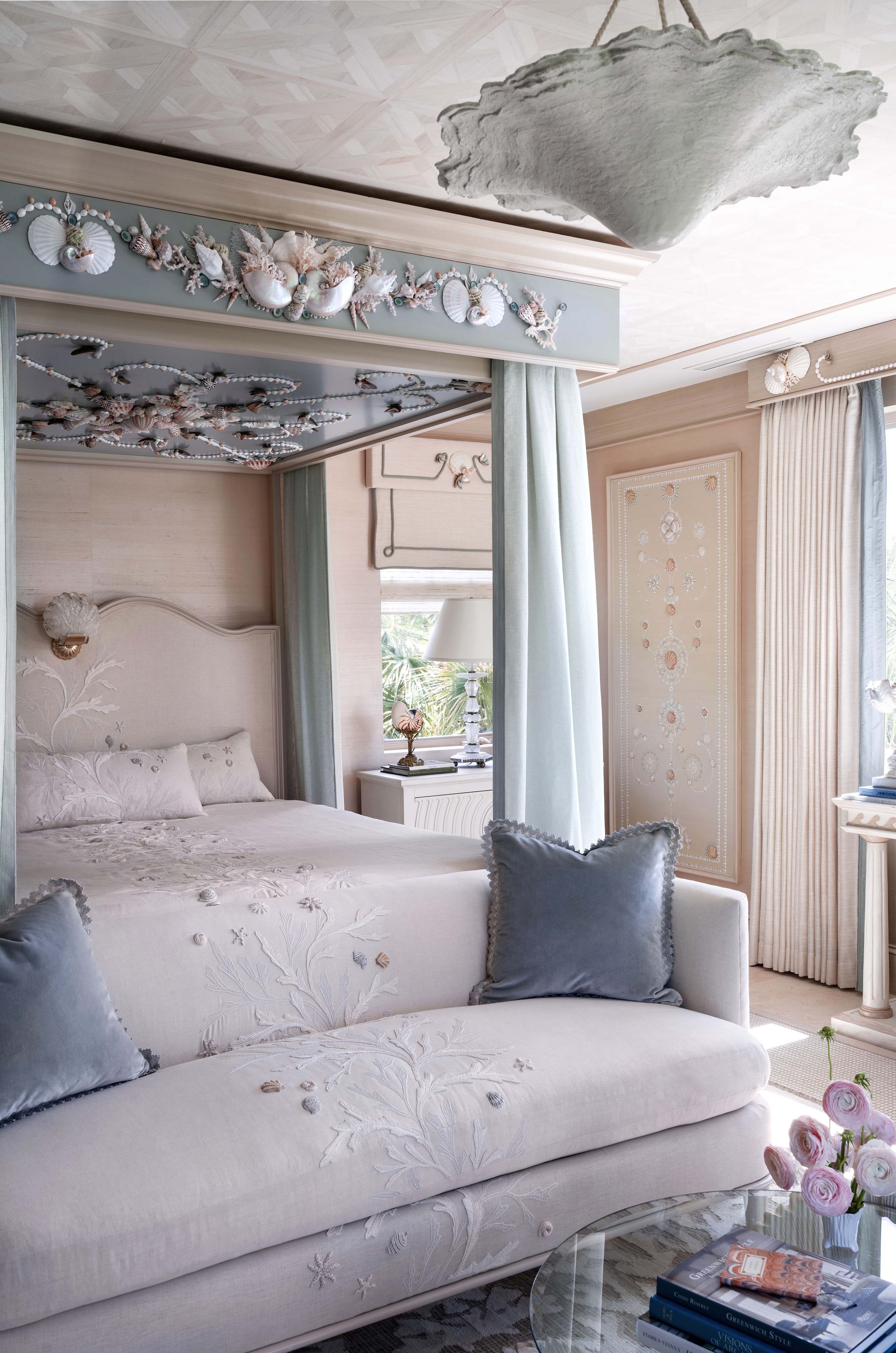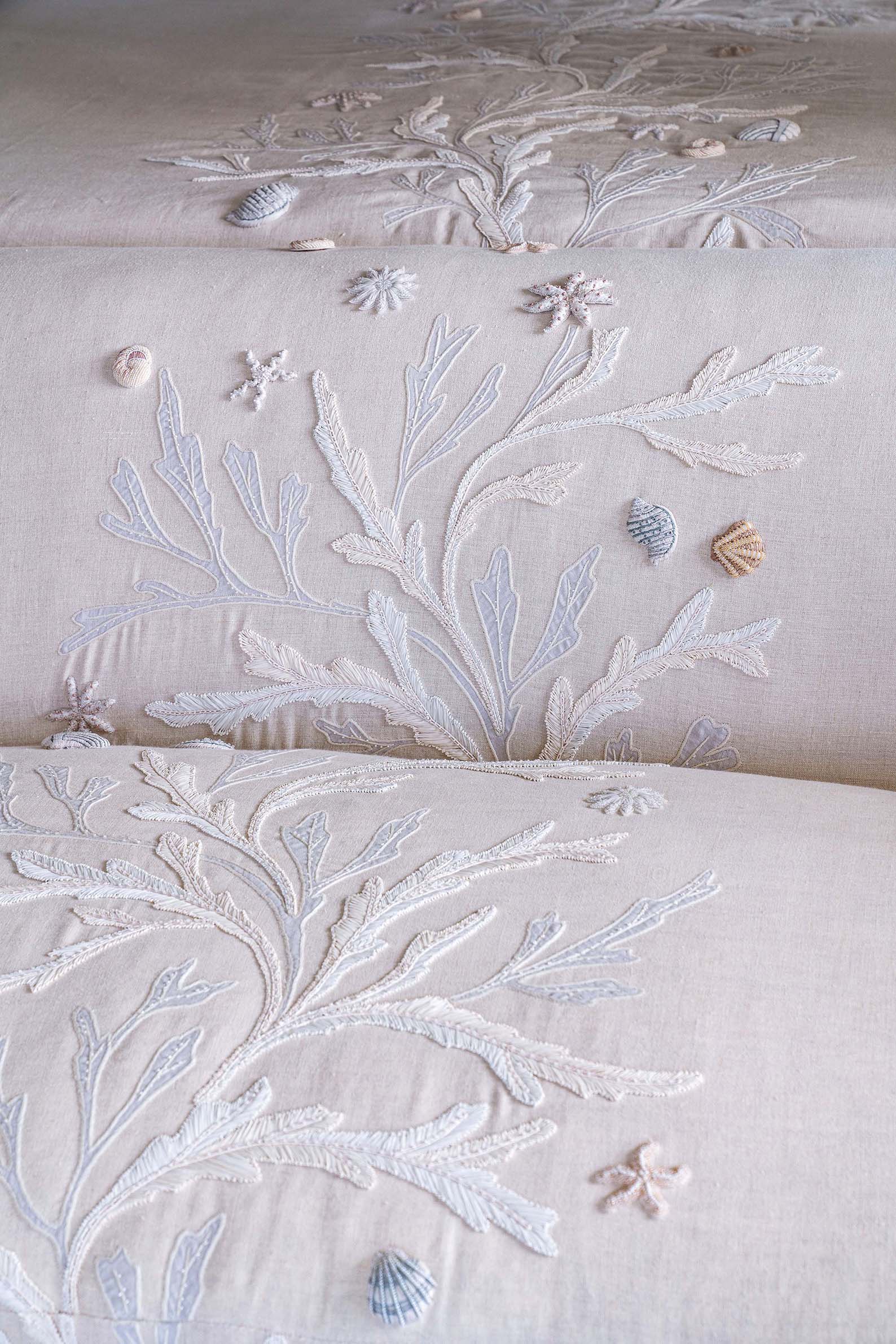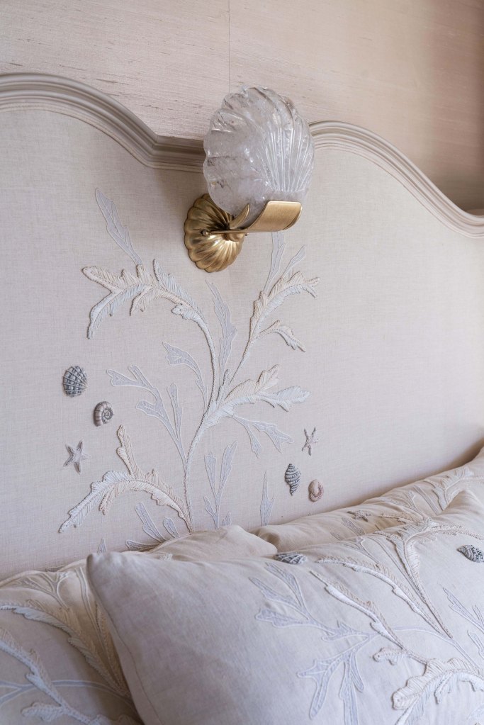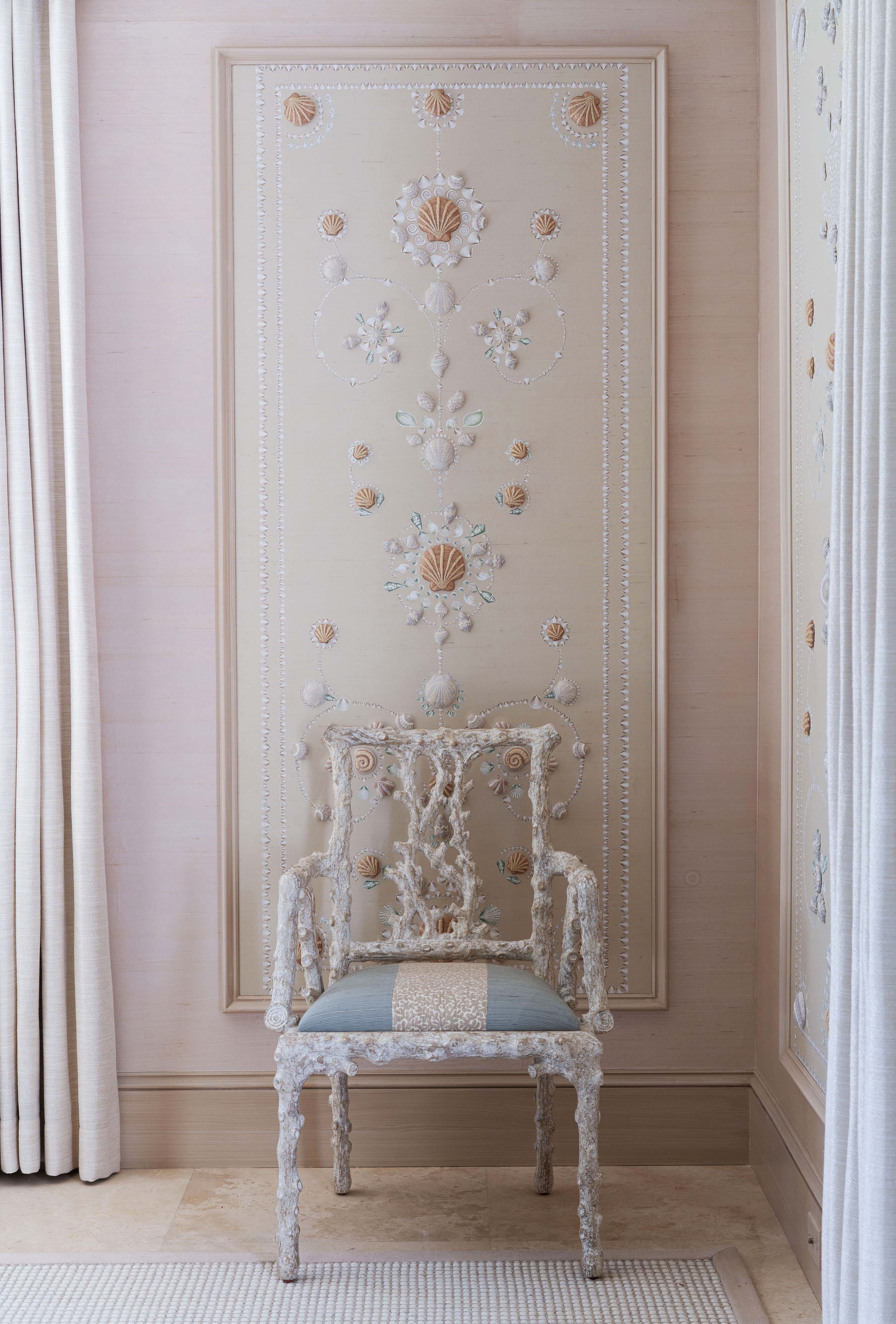 A tranquil bedroom of Rinfret’s Kips Bay Palm Beach residence with whimsical patterns of scallop shells, starfish, conch shells, and cockles. Cascading down the headboard, coverlet, and seamlessly onto the sofa, our meticulously crafted ‘Corail’ features textural raffia to replicate sea coral, complemented by delicate hand-beaded shells that add an additional layer of dimensionality to the design.