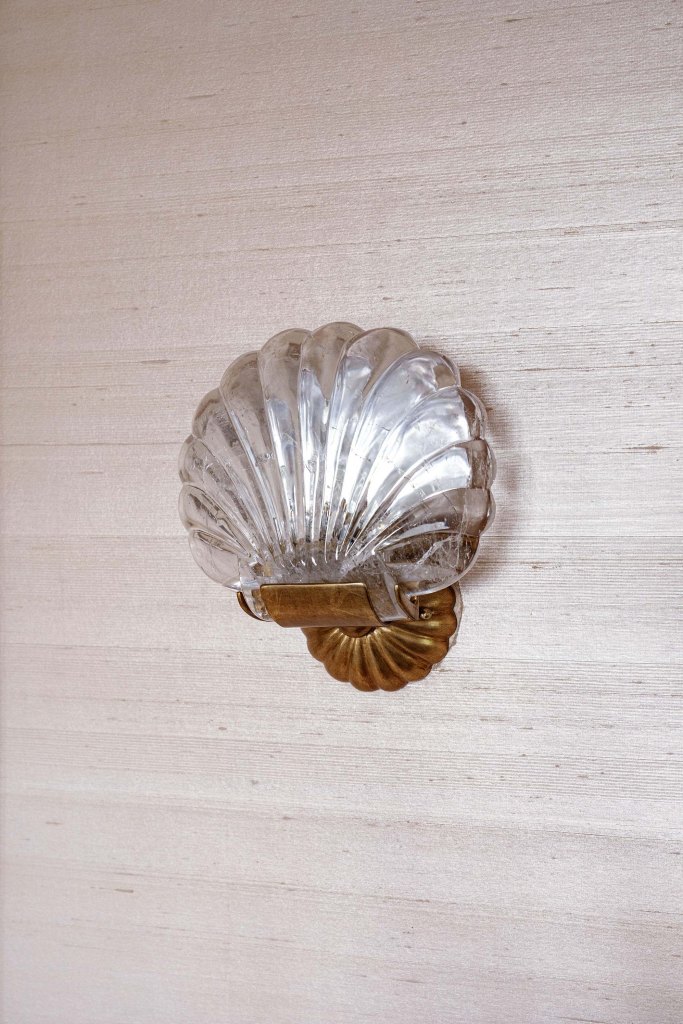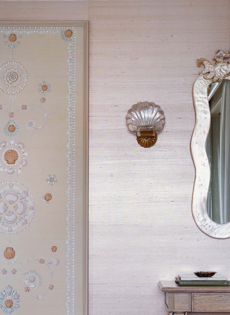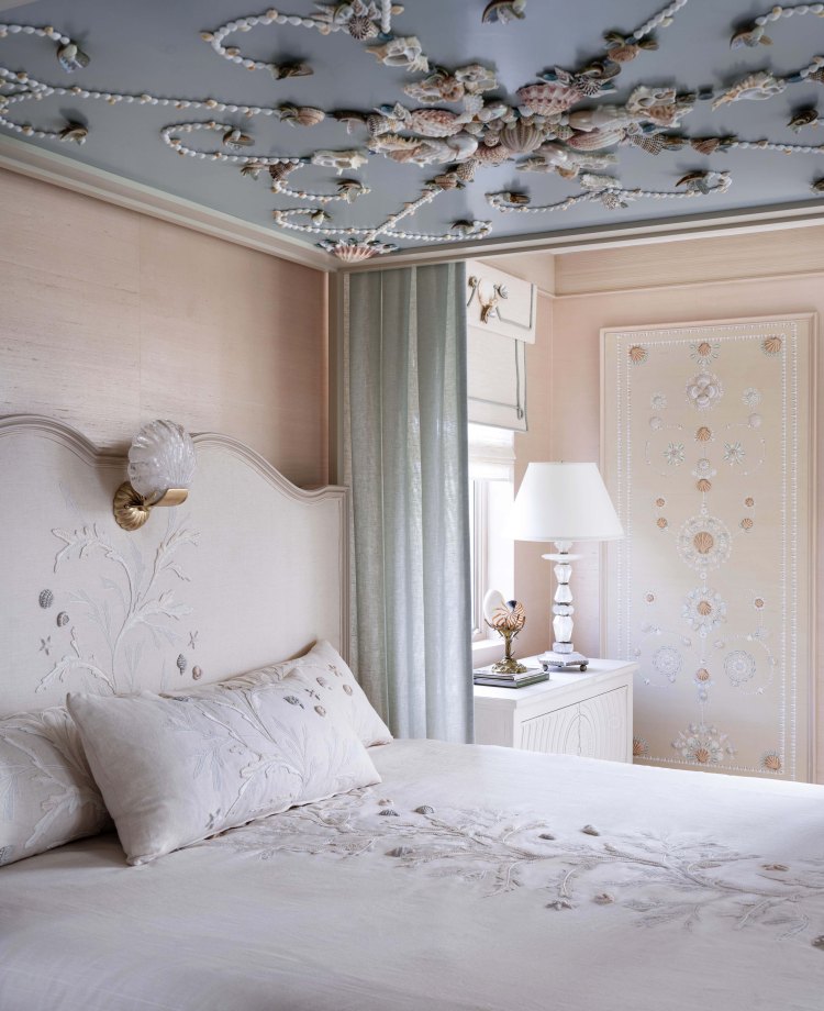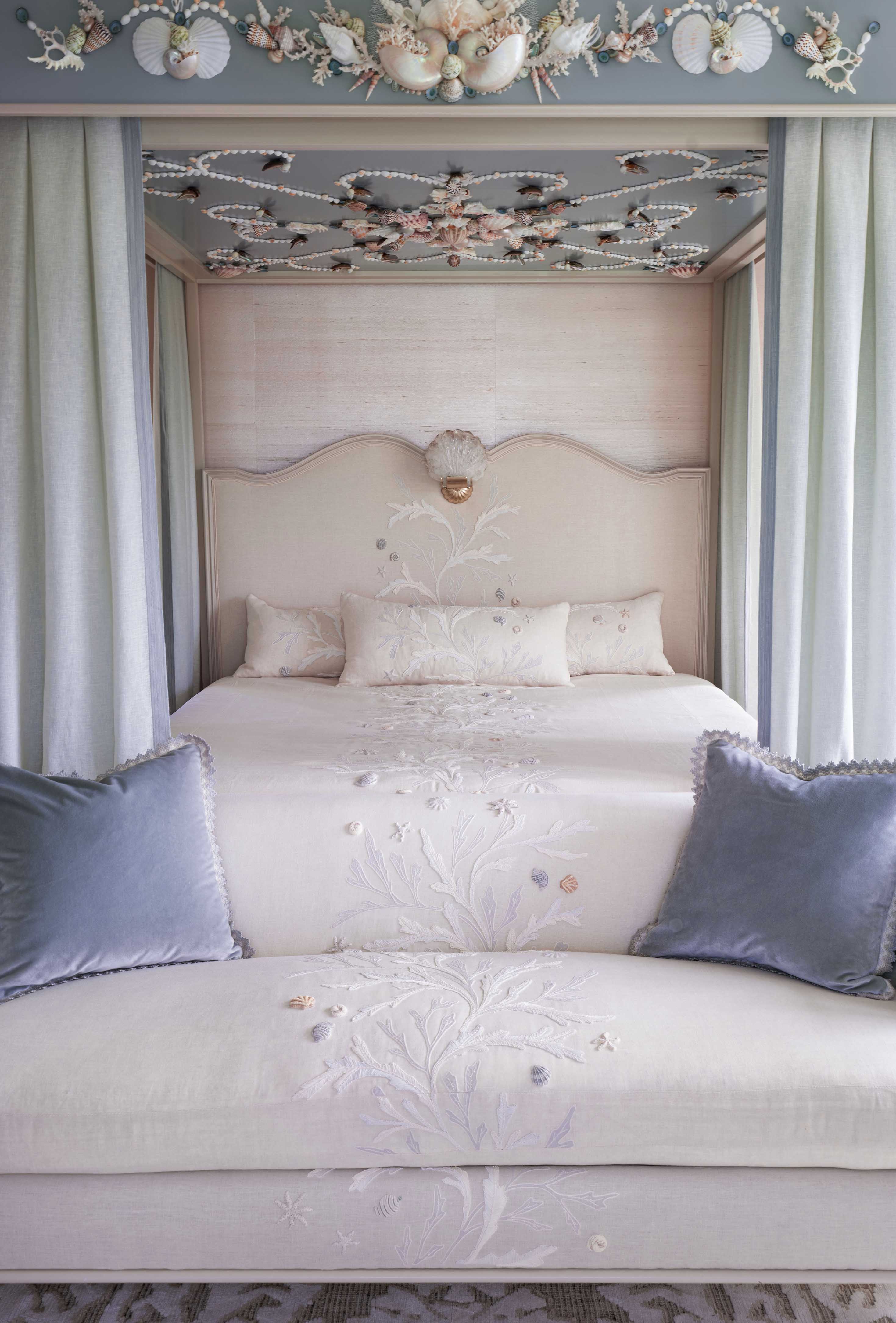 A tranquil bedroom of Rinfret’s Kips Bay Palm Beach residence with whimsical patterns of scallop shells, starfish, conch shells, and cockles. Cascading down the headboard, coverlet, and seamlessly onto the sofa, our meticulously crafted ‘Corail’ features textural raffia to replicate sea coral, complemented by delicate hand-beaded shells that add an additional layer of dimensionality to the design.