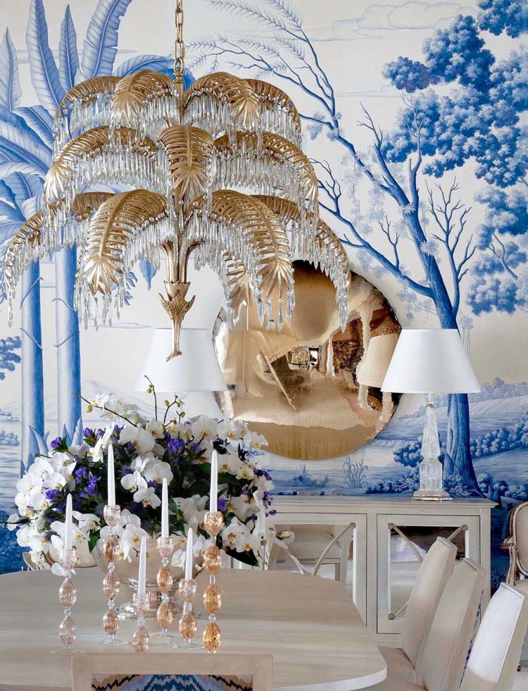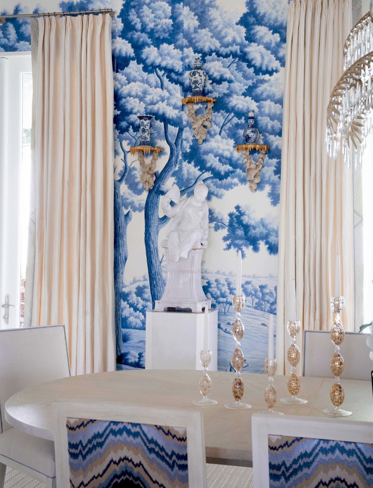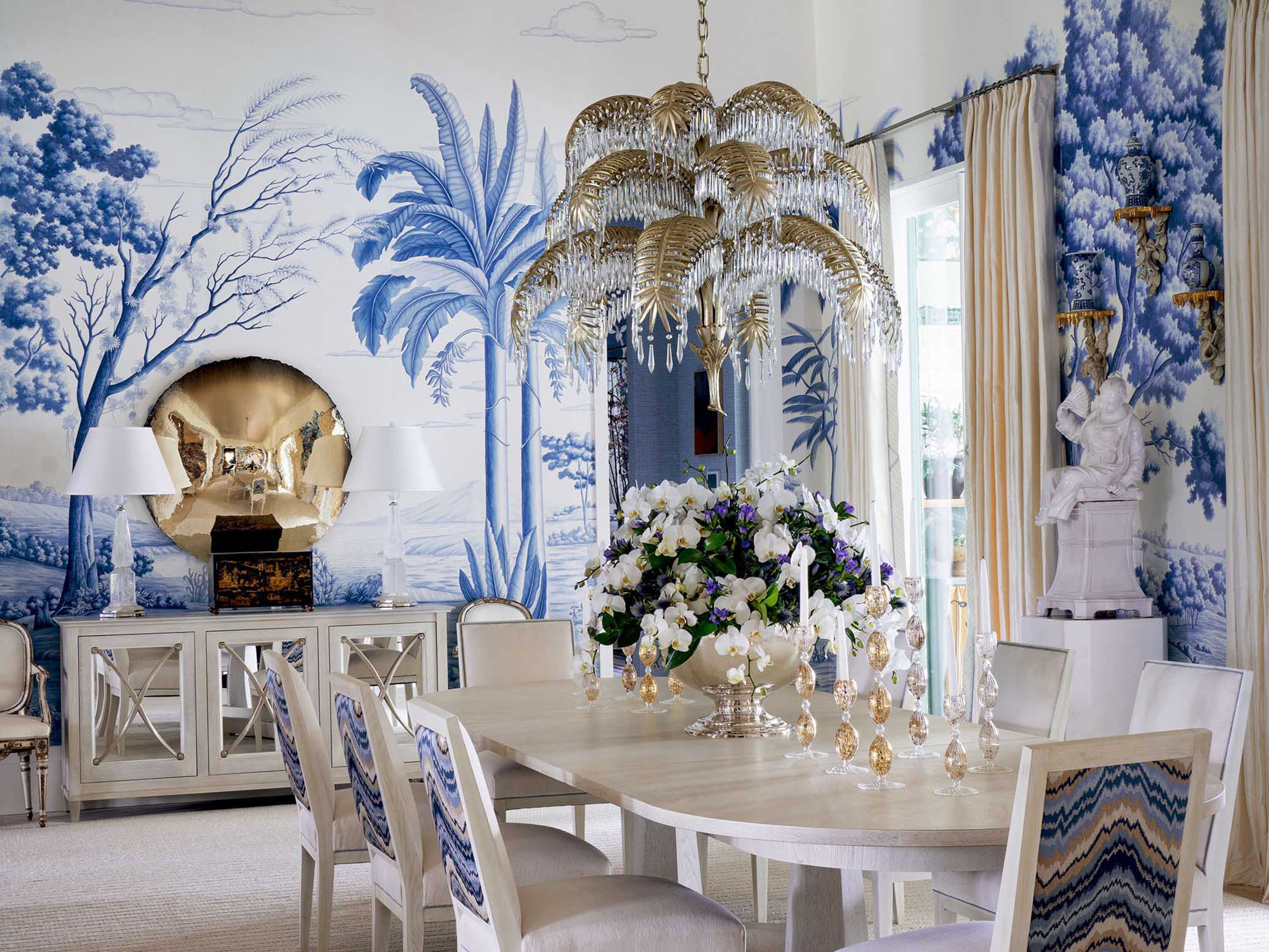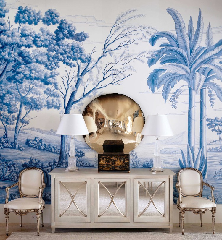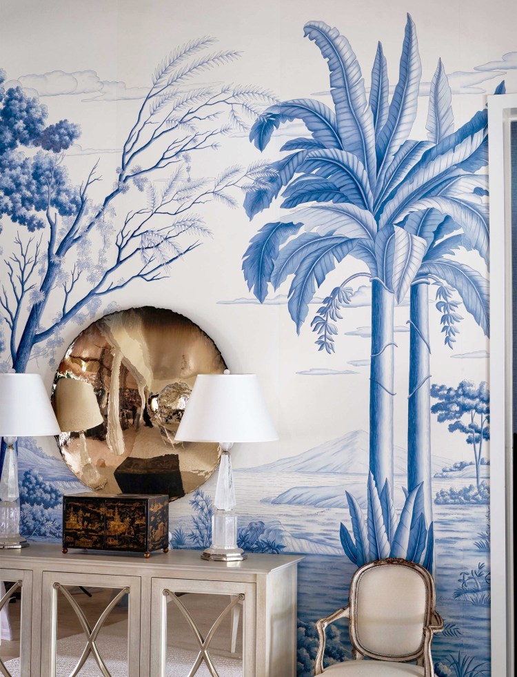 ‘La Mer Pacifique’ is a spectacular rendition of a historic mural designed by Jean-Gabriel Charvet for Dufour et Cie that was first exhibited at the 1806 Paris Industrial Exposition. The Polynesian-inspired scenic landscape – rendered in a crisp blue and white colourway – offers a serene tropical escape within the dining room designed by Tristan Harstan at Kips Bay Palm Beach.