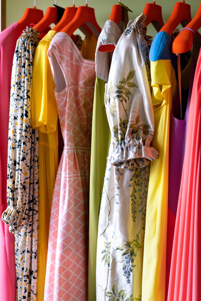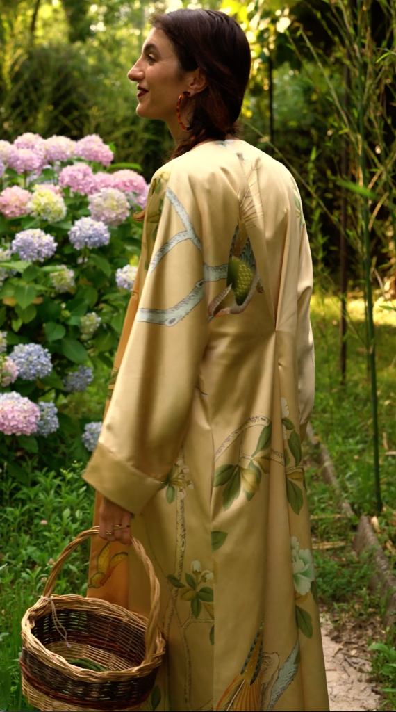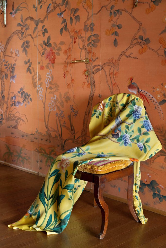de Gournay have been working on a unique project with Italian designer Marta Ferri, renowned for her elegant dresses in colourful, uplifting prints, exclusively made with upholstery fabrics. Marta has re-purposed some of the hand painted fabrics from the archive, previously created for interiors and no longer in use, to create a small number of custom-made pieces, put together entirely by hand in her Milanese atelier.