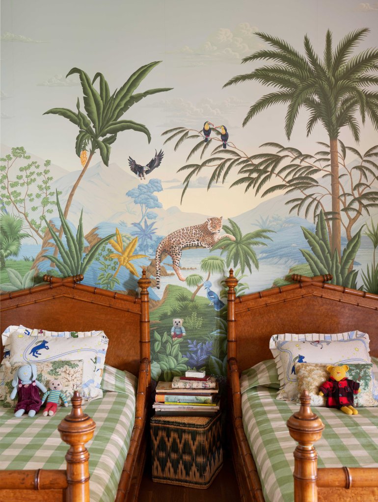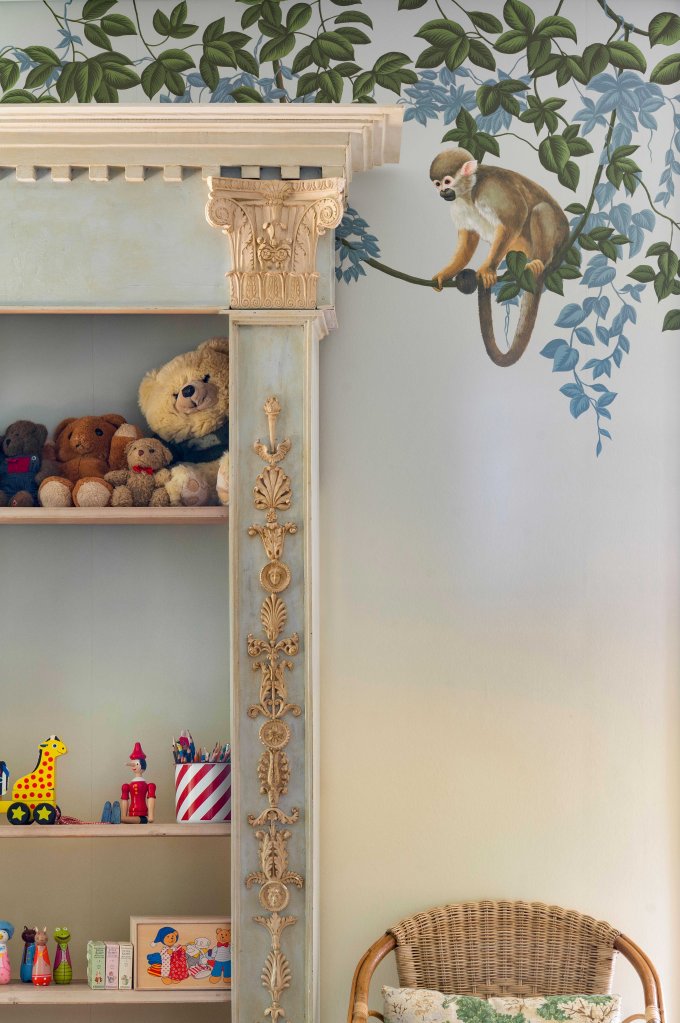 A bespoke scenic wallpaper created with Marta Ferri for her children’s bedroom, depicting an exotic landscape filled with wildlife and teeming foliage. The lush tropical scene transports its young inhabitants to faraway lands, courtesy of striking Jaguar, Giraffes, Zebra and Monkeys. A captivating installation, with the hand painted addition of one of their very own soft toys hidden within the landscape.