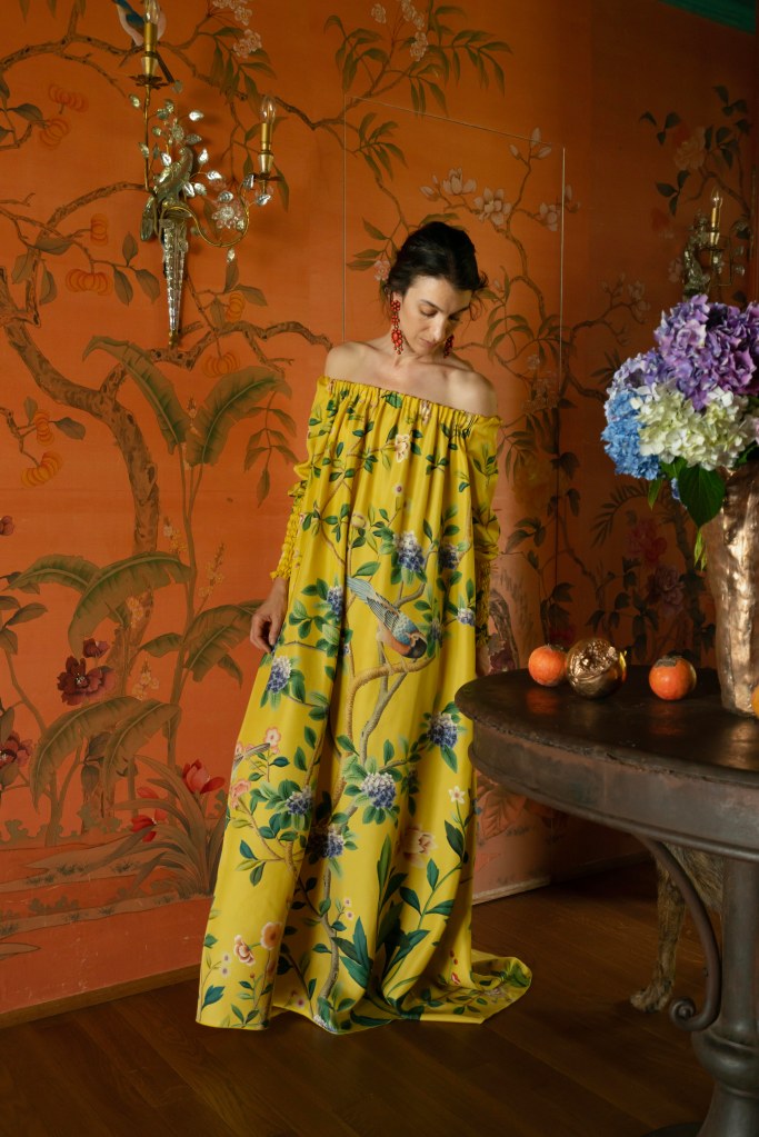 de Gournay have been working on a unique project with Italian designer Marta Ferri, renowned for her elegant dresses in colourful, uplifting prints, exclusively made with upholstery fabrics. Marta has re-purposed some of the hand painted fabrics from the archive, previously created for interiors and no longer in use, to create a small number of custom-made pieces, put together entirely by hand in her Milanese atelier.